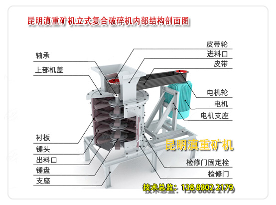 從整體來(lái)看,復合式破碎機包括傳動(dòng)裝置、機體、進(jìn)出料器、支座組成,主要的機體部分往細了說(shuō)又可分為機蓋、機殼、錘頭、錘盤(pán)、襯板、中心軸等,錘頭按放射狀布局固定于錘盤(pán)上,錘盤(pán)則呈堆疊層狀按固定間距固定在中心軸上,具體結構布局可參見(jiàn)下面的立式復合破碎機內部結構剖面圖: