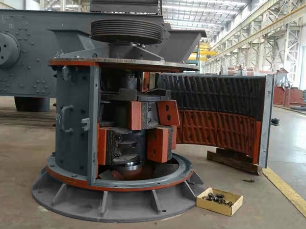 待破碎的物料從機體上方的入料口自由落體進(jìn)入破碎腔上方的甩料裝置上,在離心力的作用下被放射狀拋向裝有襯板的內壁,與其發(fā)生猛烈碰撞、物料之間相互撞擊,而后進(jìn)入錐形破碎腔內錘頭作用區,被高速運動(dòng)的錘頭打擊、切削、擠壓,在錘頭和襯板之間反復折返被多次破碎。不同時(shí)間進(jìn)入破碎腔內的物料形成相對運動(dòng),達到“石打石”的粉碎作用,物料的粒形和強度得到進(jìn)一步提升。錐形轉子與襯板存在的斜度有利于破碎形成的較小物料比大塊物料更快通過(guò),從而達到選擇性破碎的效果。最終破碎完畢的物料顆粒從集體下方的出料口排出。